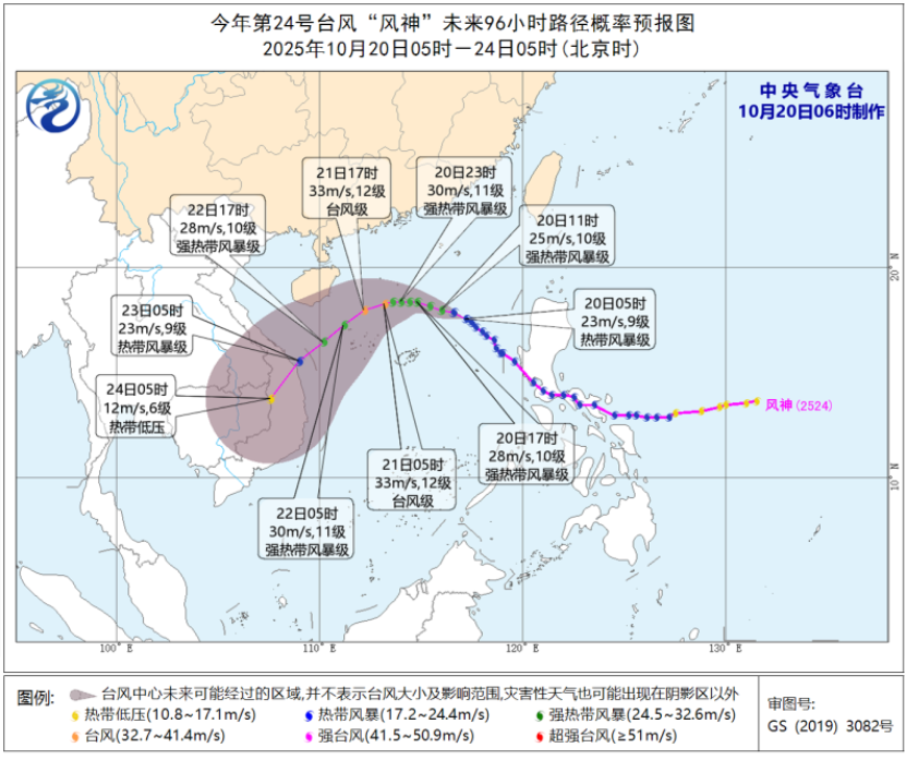 今年第24号台风“风神”未来96小时路径概率预报图通配资。2025年10月20日05时至24日05时