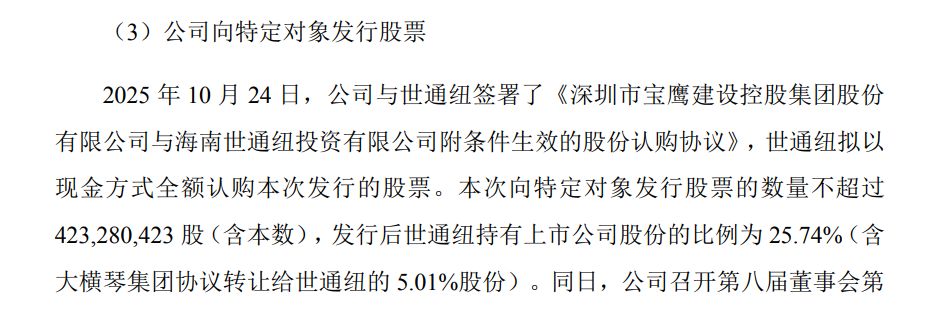 世通纽与大横琴集团及其关联方大横琴股份(香港)有限公司签署《表决权放弃协议》,约定大横琴集团无条件放弃行使其持有的全部宝鹰股份的股份(20.37%)对应的表决权;大横琴股份(香港)有限公司则无条件放弃行使其持有的宝鹰股份(2%)对应股份数量为3032.46万股的表决权。